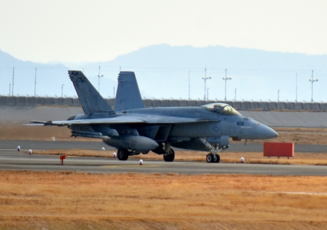米海軍艦載機 F/A-18E スーパーホーネット 戦闘攻撃機(岩国基地)、NF、404番機が着陸 12時39分に離陸した機。1時間29分の飛行でした。 |