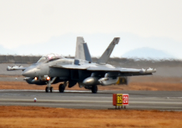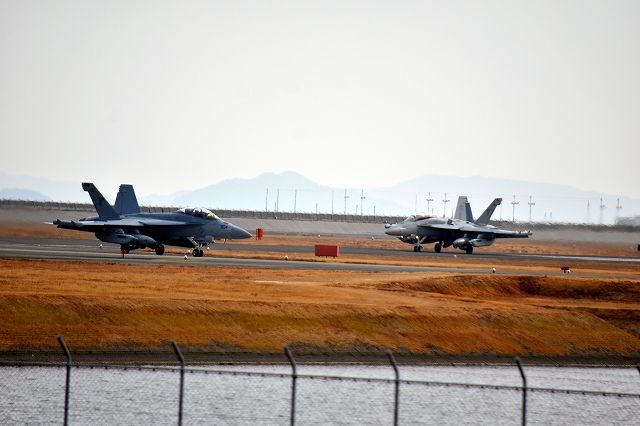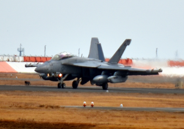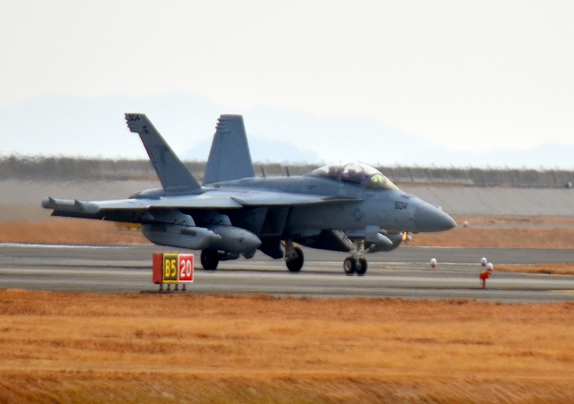 米海軍艦載機 EA-18G グラウラー 電子戦戦闘攻撃機(岩国基地)、NF、504番機が着陸 12時27分に離陸した機。1時間34分の飛行でした。 |