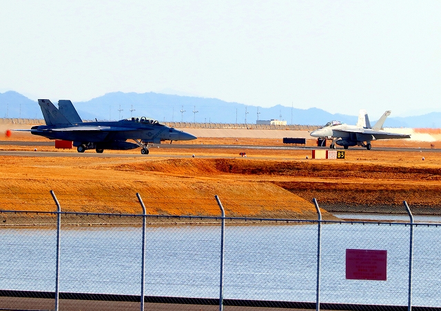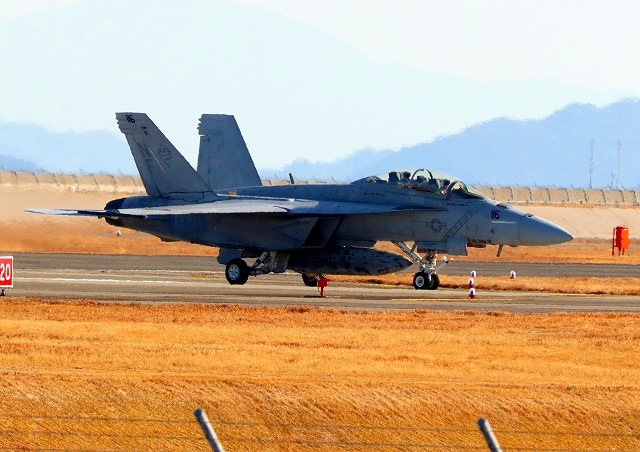 米海軍艦載機 F/A-18F スーパーホーネット 戦闘攻撃機(岩国基地)、NF、116番機が着陸 13時30分に離陸した機。1時間30分の飛行でした。 |