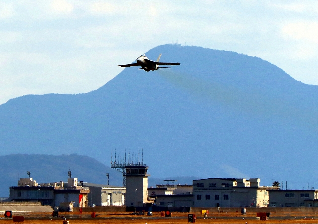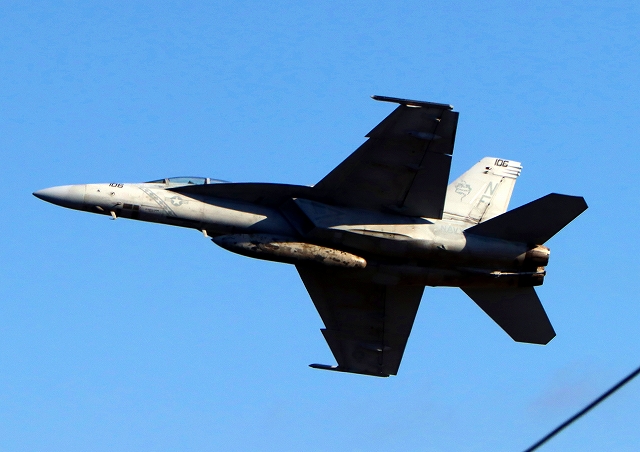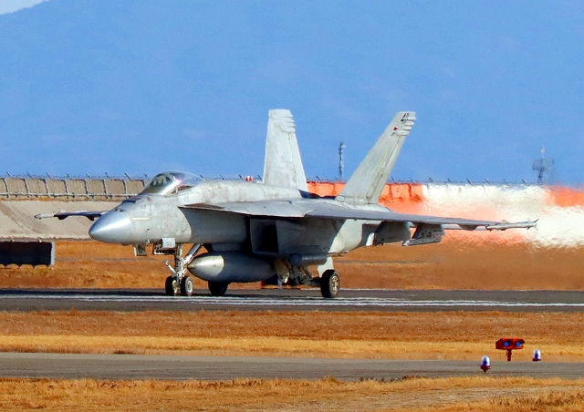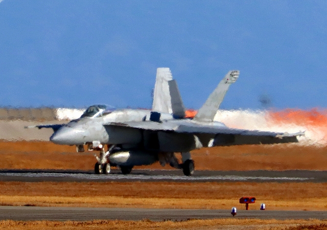米海軍艦載機 F/A-18F スーパーホーネット 戦闘攻撃機(岩国基地)、NF、106番機が離陸 |