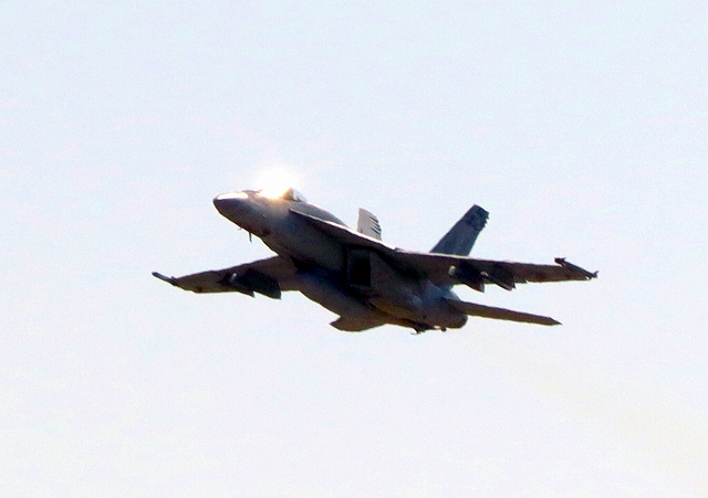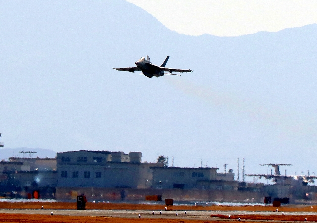 米海軍艦載機 F/A-18E スーパーホーネット 戦闘攻撃機(岩国基地)、NF、401番機が離陸 |