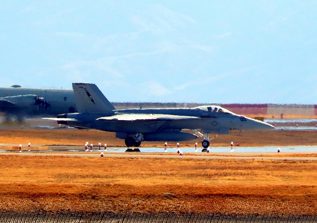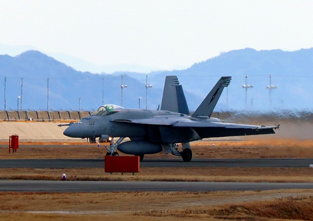 米海軍艦載機 F/A-18E スーパーホーネット 戦闘攻撃機(岩国基地)、120番機?が着陸 |