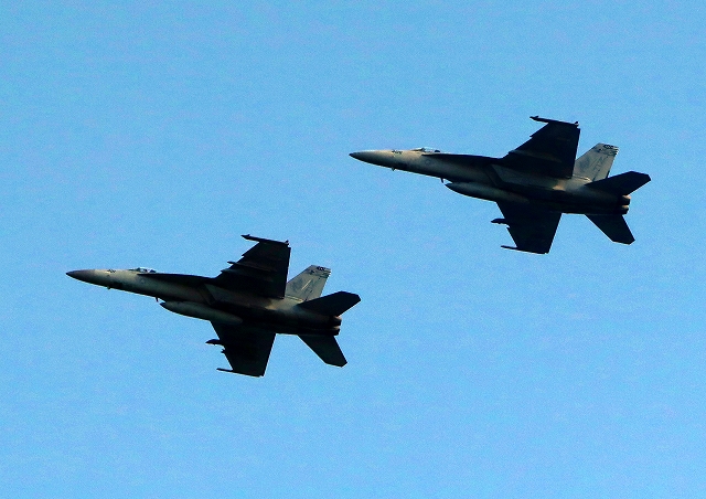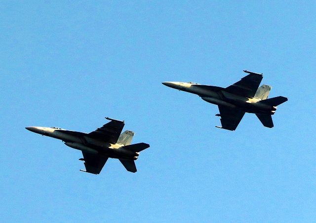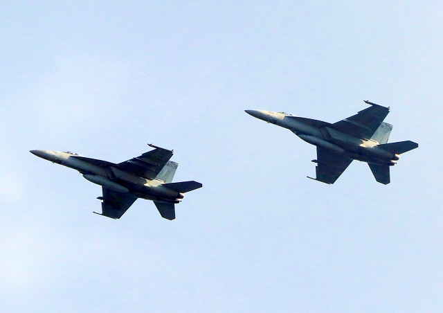米海軍艦載機 F/A-18E スーパーホーネット 戦闘攻撃機(岩国基地)、NF、401番機、406番機が2機編隊で帰還 |