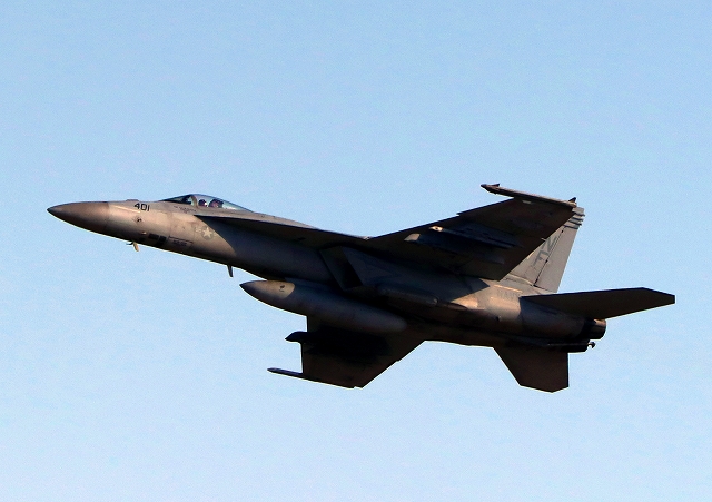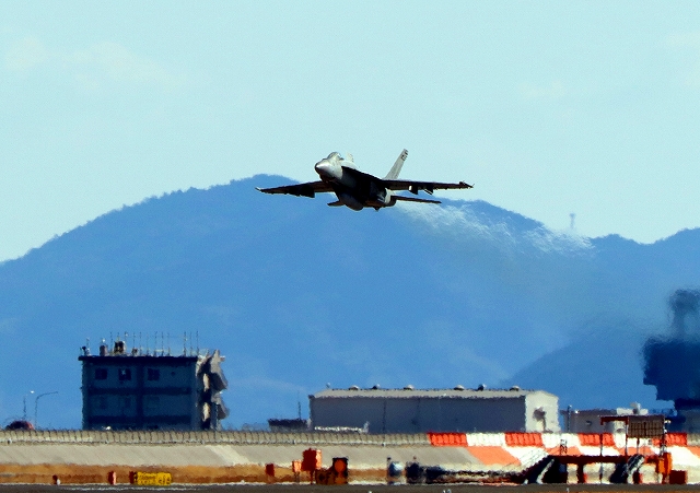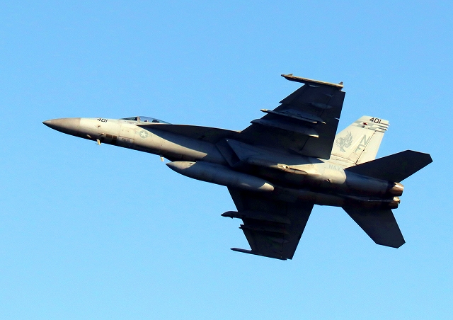 米海軍艦載機 F/A-18E スーパーホーネット 戦闘攻撃機(岩国基地)、NF、401番機が離陸 |
