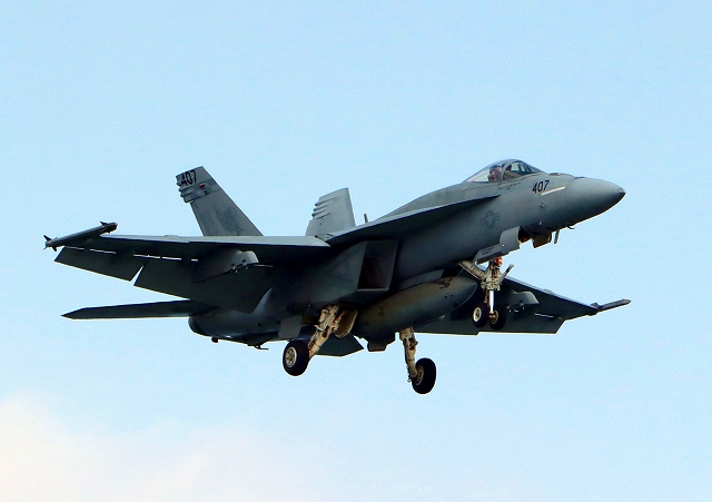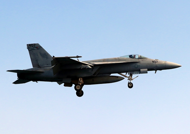 米海軍艦載機 F/A-18E スーパーホーネット 戦闘攻撃機(岩国基地)、NF、407番機が着陸 |