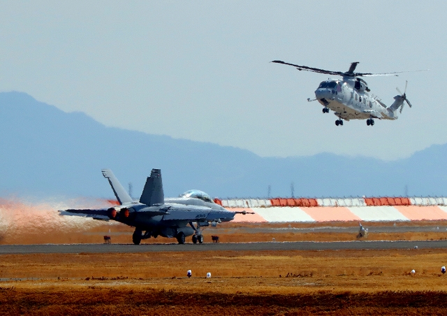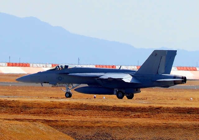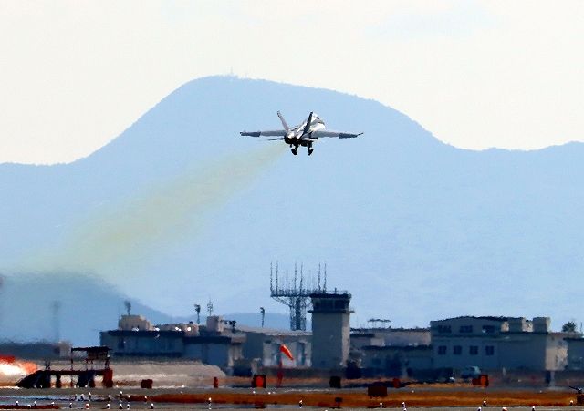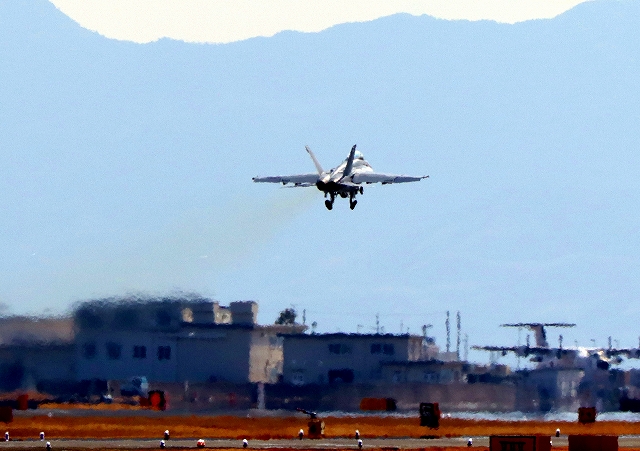 米海軍艦載機 F/A-18E スーパーホーネット 戦闘攻撃機(岩国基地)、番号未記入機が離陸 |