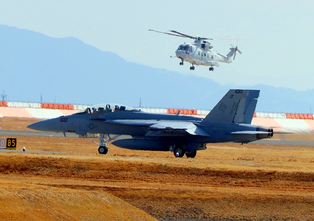 米海軍艦載機 F/A-18F スーパーホーネット 戦闘攻撃機(岩国基地)、NF、100番機が離陸 |
