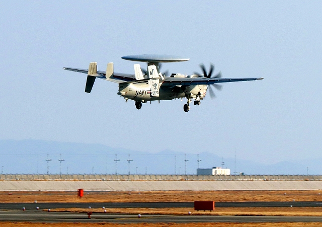 米海軍艦載機 E-2D アドヴァンスド・ホークアイ 早期警戒機(岩国基地)、603番機がタッチアンド・ゴーして旋回 |