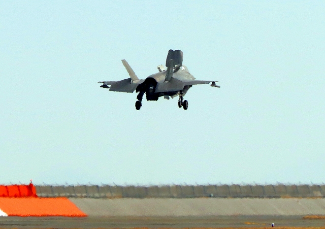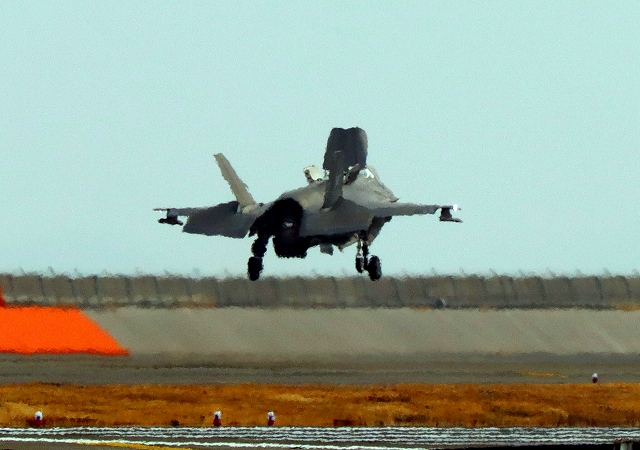米海兵隊 F-35B ライトニングⅡ 戦闘機(岩国基地)、DT、29番機が帰還、垂直着陸パッドの上でホバリング |