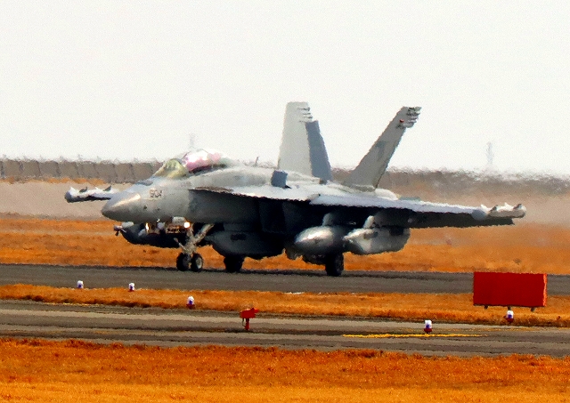 米海軍艦載機 EA-18G グラウラー 電子戦戦闘攻撃機(岩国基地)、NF、502番機が着陸 13時36分に離陸した機。1時間40分の飛行でした。 |