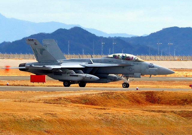 米海軍艦載機 EA-18G グラウラー 電子戦機戦闘攻撃機(岩国基地)、NF、502番機が着陸 14時 |