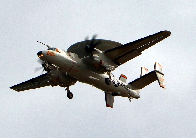 米海軍艦載機 E-2D アドヴァンスド・ホークアイ 早期警戒機(岩国基地)、600番機が帰還、旋回 |
