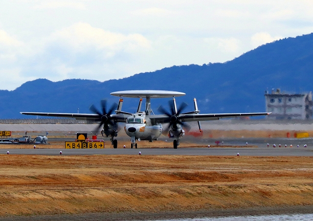米海軍艦載機 E-2D アドヴァンスド・ホークアイ 早期警戒機(岩国基地)、600番機が着陸 |