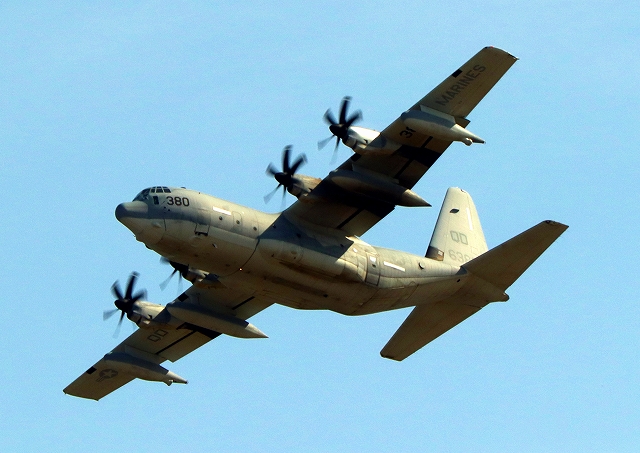 米海兵隊 KC-130J 空中給油機 スーパーハーキュリーズ(岩国基地)、QD 6380番機が離陸 |