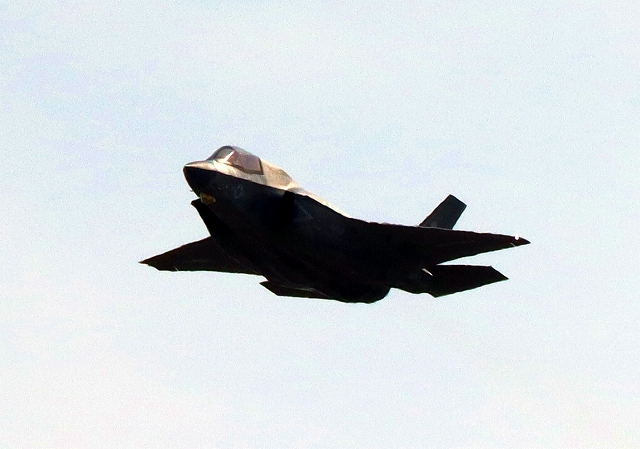 米海兵隊 F-35B ライトニングⅡ 戦闘機(岩国基地)、VK、11番機がタッチアンドゴーして旋回 |