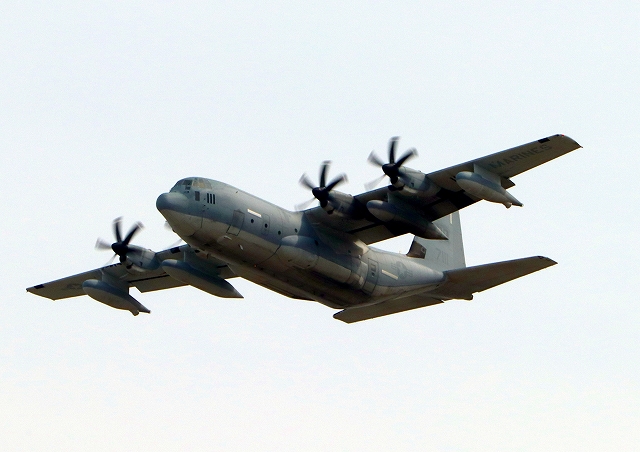 米海兵隊 KC-130J 空中給油機 スーパーハーキュリーズ(岩国基地)、QD 7111番機が離陸 |
