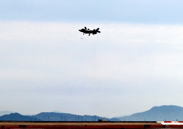 米海兵隊 F-35B ライトニングⅡ 戦闘機(岩国基地)、VK、03番機は垂直着陸パッドの上でホバリング |