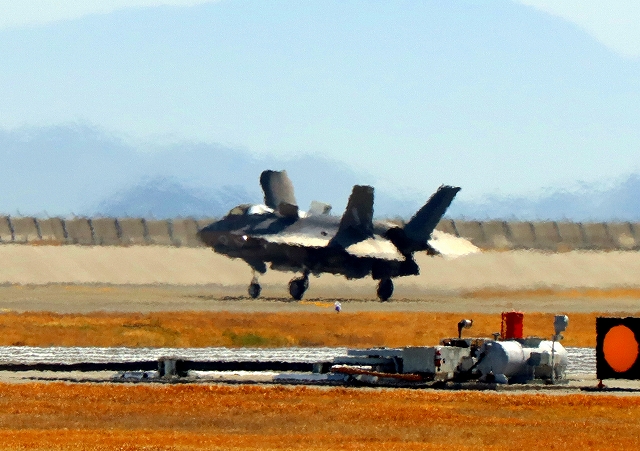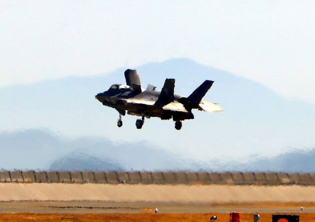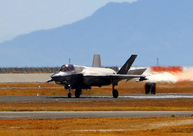 米海兵隊 F-35B ライトニングⅡ 戦闘機(岩国基地)、VK、03番機は垂直着陸パッドの上に着陸 |