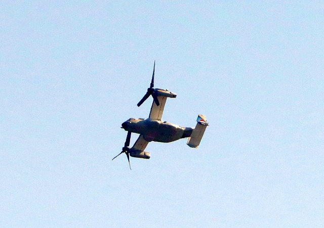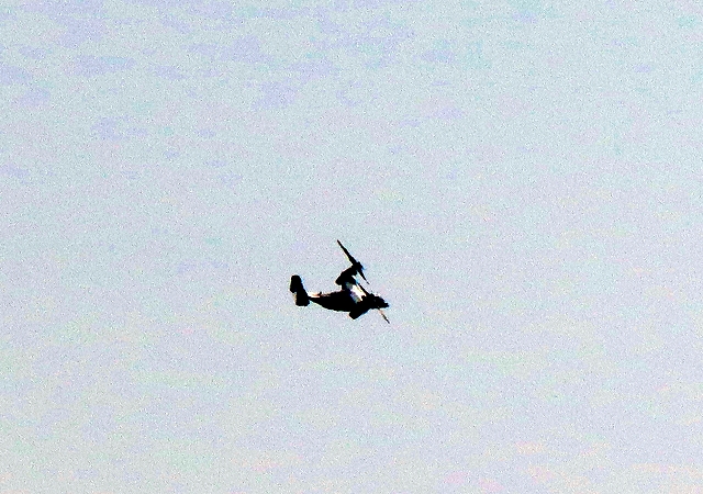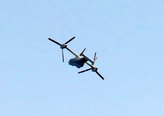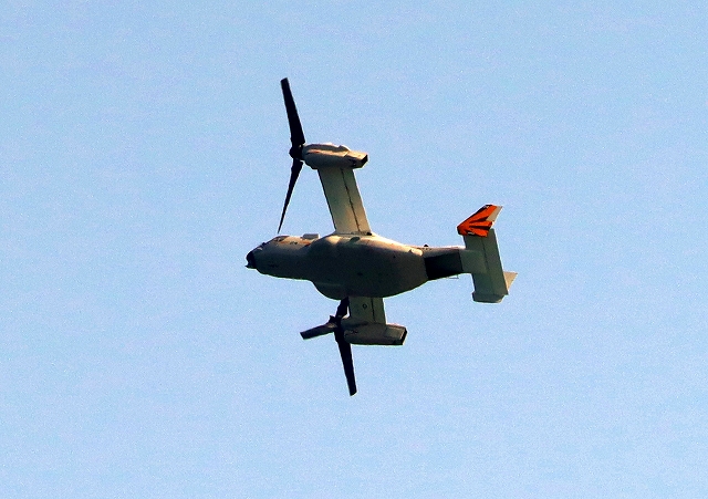 米海軍艦載機 CMV-22B オスプレイ(岩国基地)、71-9456番機 こうやって、向きを変えながら降りてきます。 |