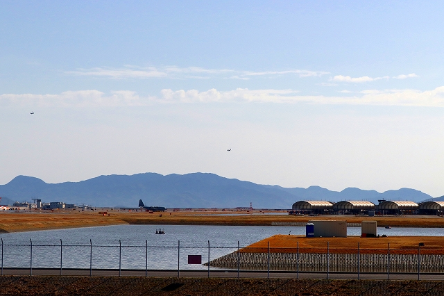 米海軍艦載機 CMV-22B オスプレイ(岩国基地)、71-9456番機、空母カールビンソン搭載、米海軍艦載機 CMV-22 オスプレイ、24-9454番機に降りてきます。通常ならこのあたりから撮影。海側を通って来たのか、陸側を通って来たのか区別は着きません。 |