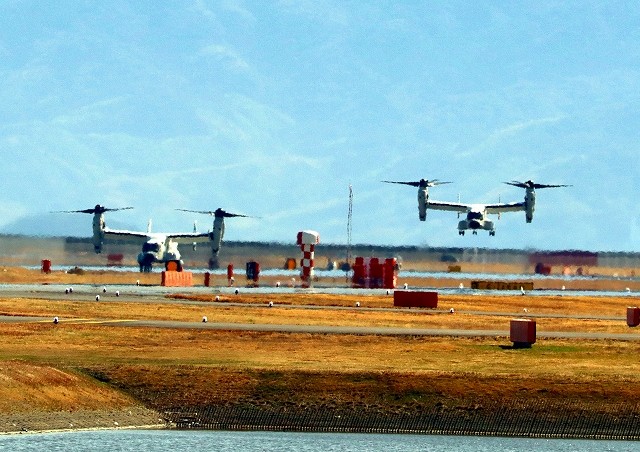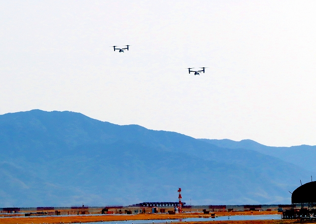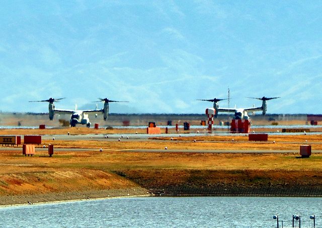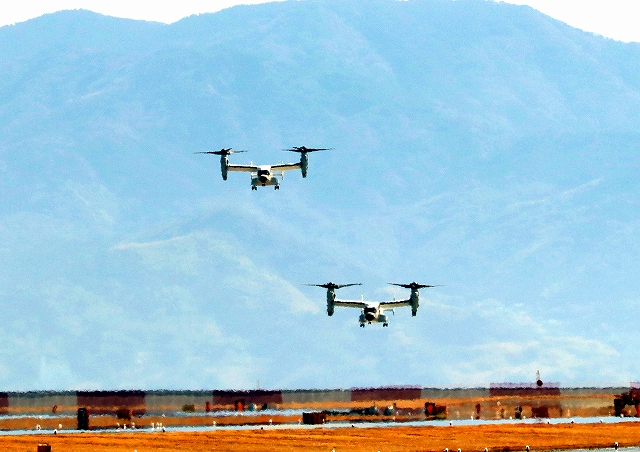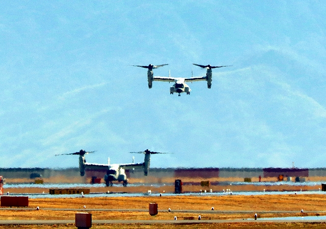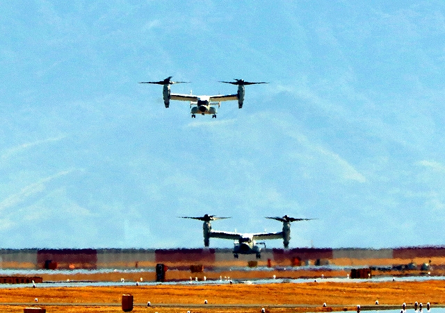 米海軍艦載機 CMV-22B オスプレイ(岩国基地)、71-9456番機、空母カールビンソン搭載、米海軍艦載機 CMV-22 オスプレイ、24-9454番機に降りてきます。 |
