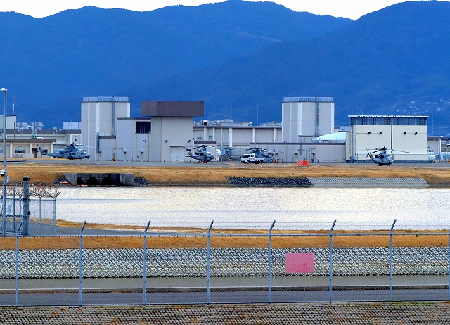 米海兵隊 UH-1Y 汎用ヘリ ベノム(普天間基地)、米海兵隊 AH-1Z 戦闘攻撃ヘリ バイパー(普天間基地)。4機が外来機駐機場に。 |