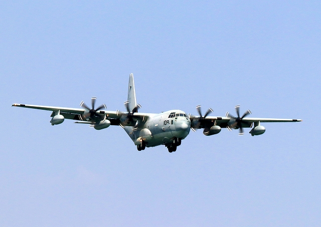 米海兵隊 KC-130J 空中給油機 スーパーハーキュリーズ(岩国基地)、QD 7109番機が着陸 |