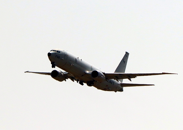 米海軍 P-8A 海上哨戒機 ポセイドン(嘉手納基地、三沢基地)、CF、756番機がタッチアンド・ゴーして旋回 |
