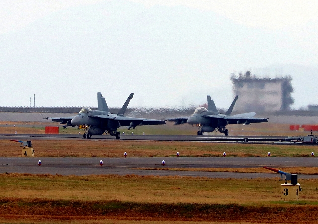 米海軍艦載機 F/A-18E/F スーパーホーネット 戦闘攻撃機(岩国基地)、NF、405番機、110番機がグアムから帰還、着陸 |