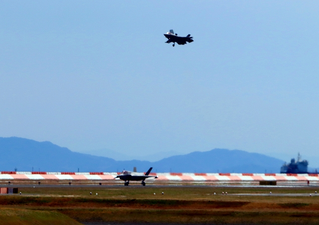米海兵隊 F-35B ライトニングⅡ 戦闘機(岩国基地)、DT、29番機が31番機がホバリング |