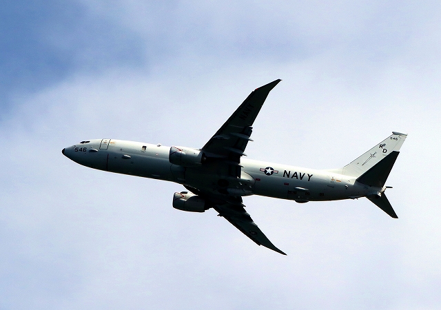 米海軍 P-8A 海上哨戒機 ポセイドン(嘉手納基地、三沢基地)、RD、546番機がタッチアンドゴーして旋回 |