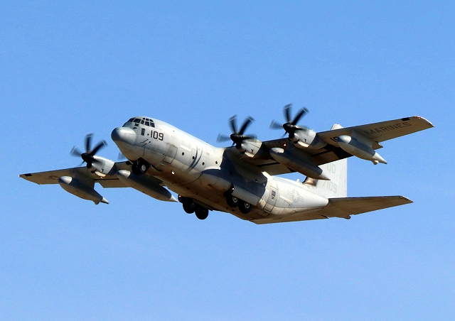 米海兵隊 KC-130J 空中給油機 スーパーハーキュリーズ(岩国基地)、QD 7109番機が離陸 |