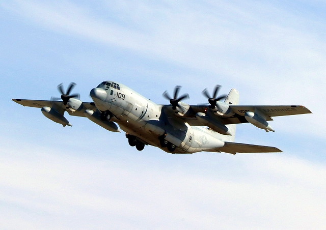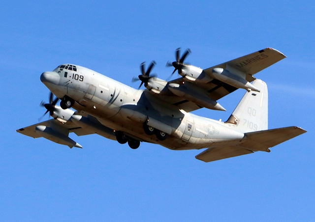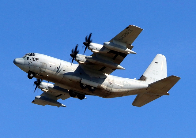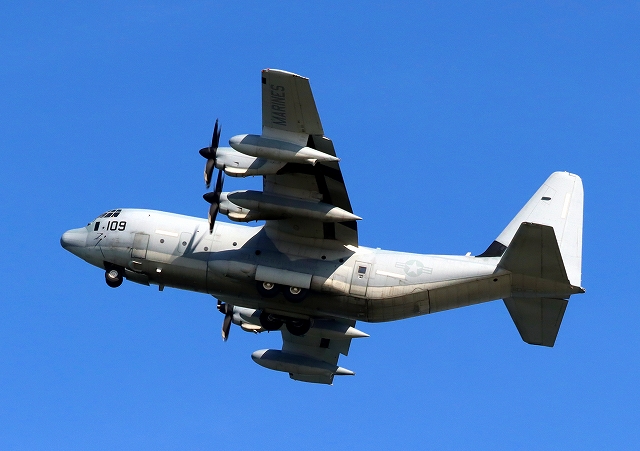 米海兵隊 KC-130J 空中給油機 スーパーハーキュリーズ(岩国基地)、QD 7109番機が旋回 |