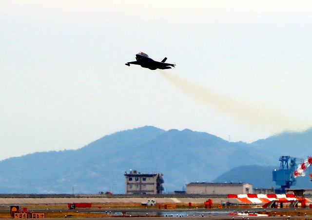 米海兵隊 F-35B ライトニングⅡ 戦闘機(岩国基地)、WE、02番機が離陸 |