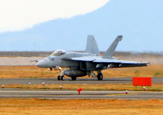 米海軍艦載機 F/A-18E スーパーホーネット 戦闘攻撃機(岩国基地)、NF、204番機が着陸 |