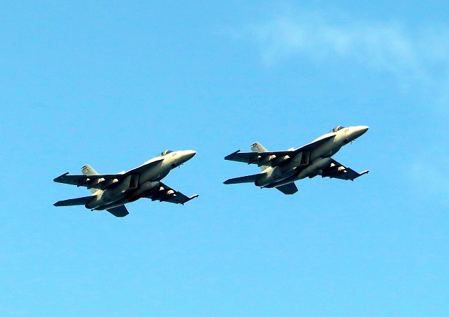 米海軍艦載機 F/A-18E スーパーホーネット 戦闘攻撃機(岩国基地)、NF、204番機、205番機が2機編隊で帰還 |
