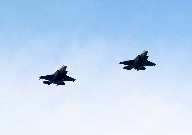 米海兵隊 F-35B ライトニングⅡ 戦闘機(岩国基地)、WE、04番機、02番機が2機編隊で帰還 |