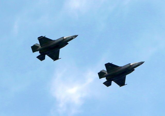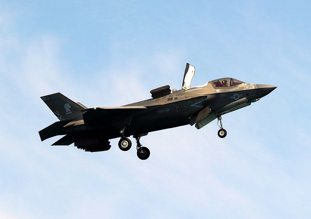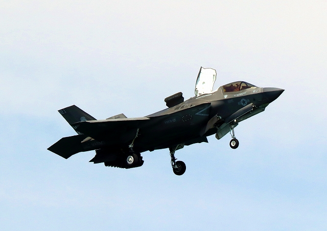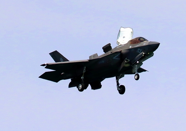 米海兵隊 F-35B ライトニングⅡ 戦闘機(岩国基地)、VK、12.1番機は南側の垂直着陸パッドの上でホバリング |