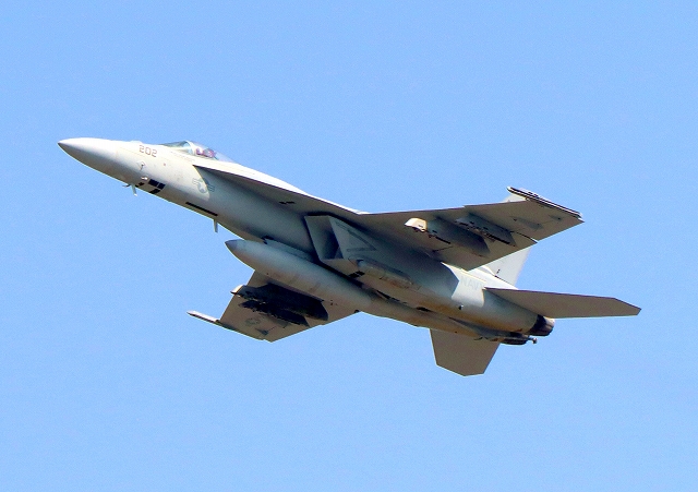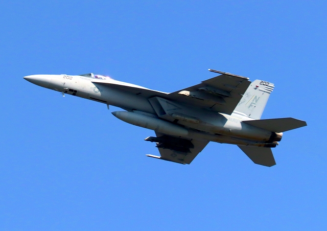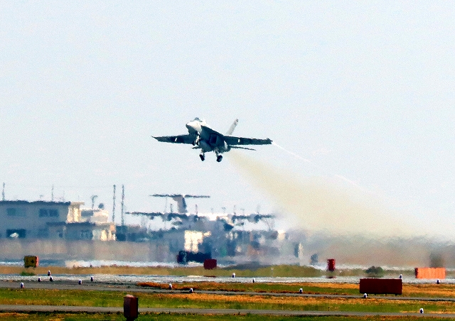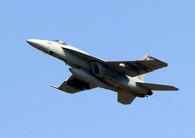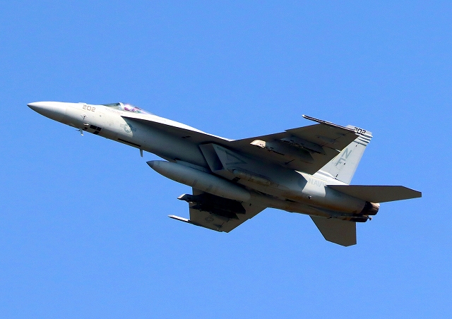 米海軍艦載機 F/A-18E スーパーホーネット 戦闘攻撃機(岩国基地)、NF 202番機が離陸 |