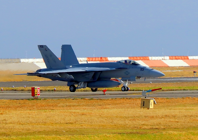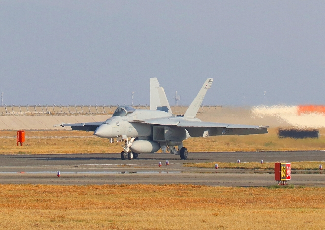 米海軍艦載機 F/A-18E スーパーホーネット 戦闘攻撃機(岩国基地)、NF、217番機が着陸 |