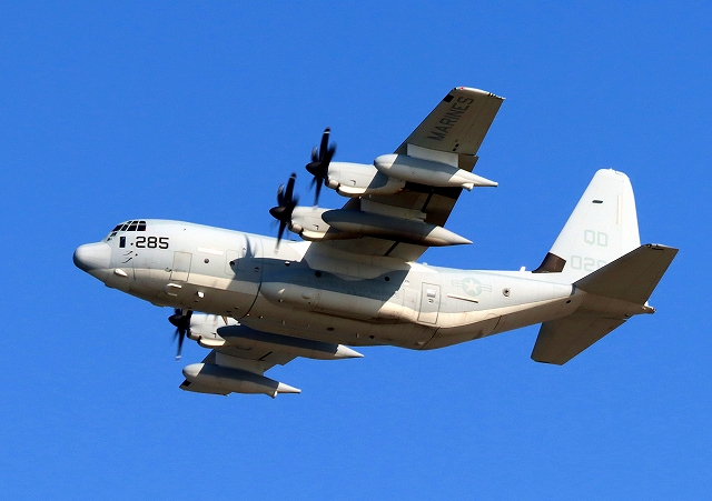 米海兵隊 KC-130J 空中給油機 スーパーハーキュリーズ(岩国基地)、QD 0285番機が離陸 |