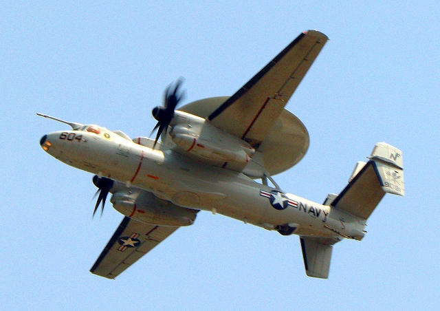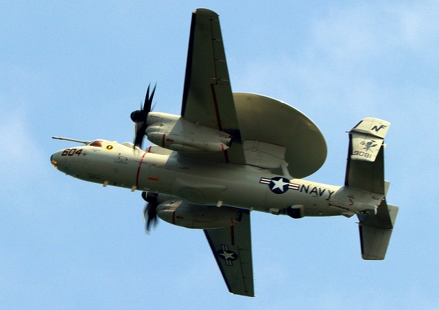 米海軍艦載機 E-2D アドヴァンスド・ホークアイ 早期警戒機(岩国基地)、604番機が旋回 |