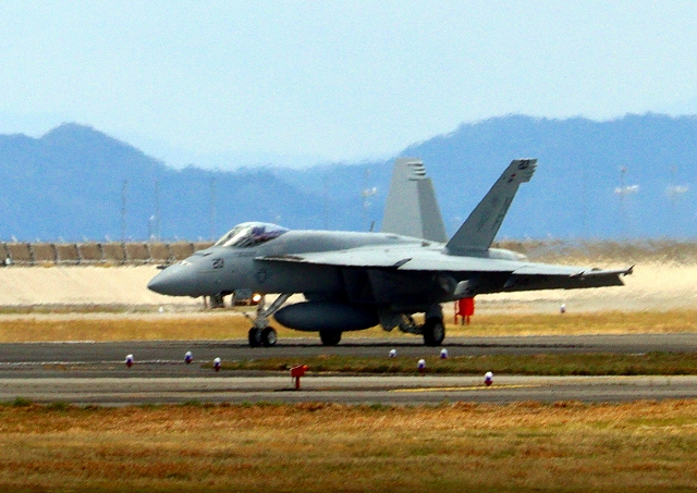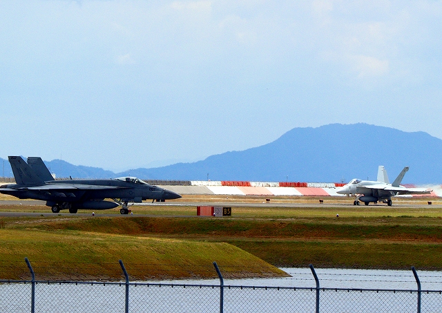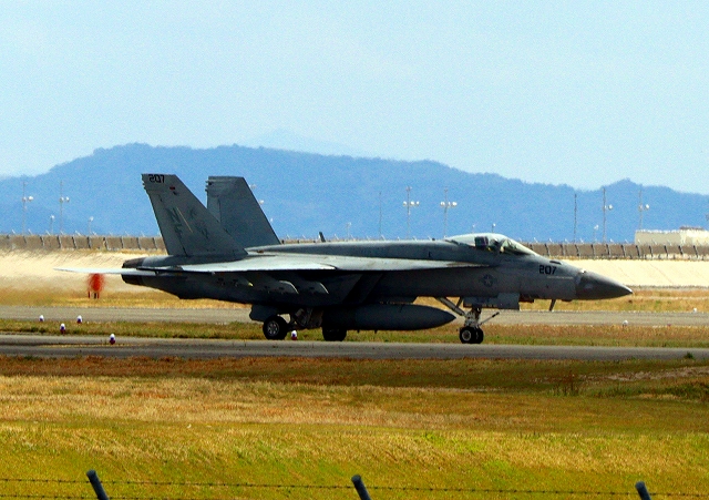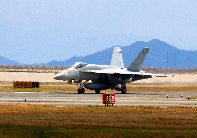 米海軍艦載機 F/A-18E スーパーホーネット 戦闘攻撃機(岩国基地)、NF、201番機が着陸 |