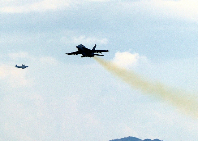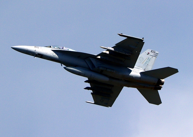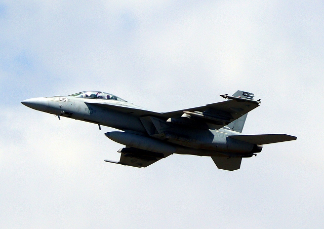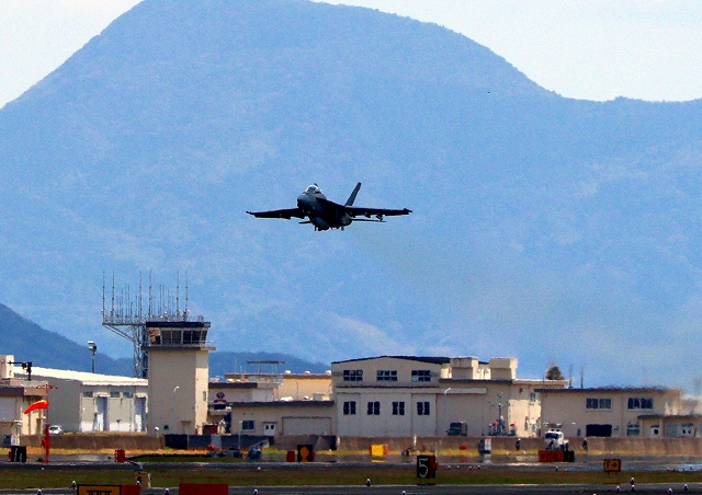 米海軍艦載機 F/A-18F スーパーホーネット 戦闘攻撃機(岩国基地)、NF、105番機が離陸 |