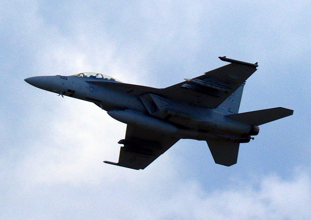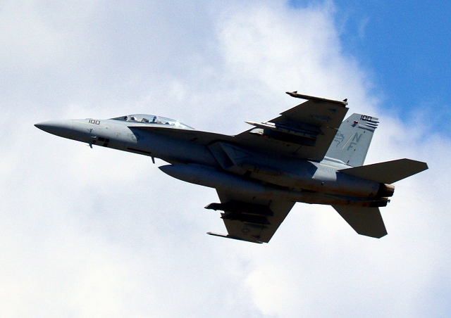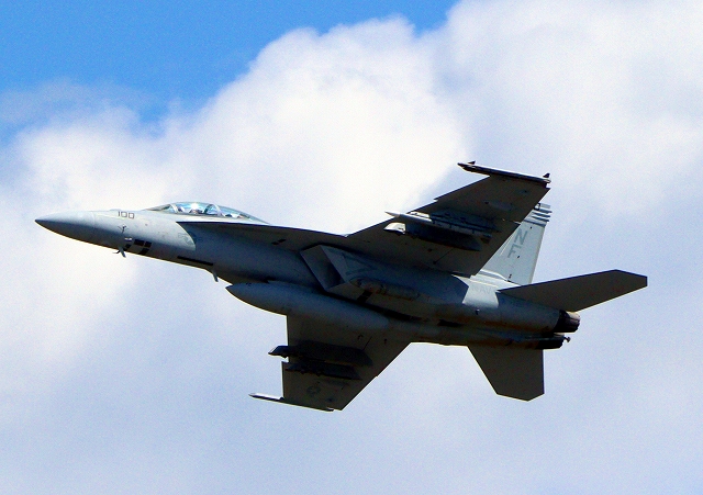 米海軍艦載機 F/A-18F スーパーホーネット 戦闘攻撃機(岩国基地)、NF、100番機が離陸 |