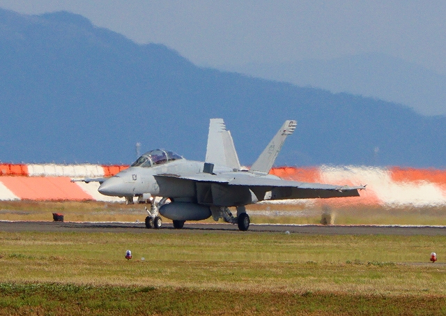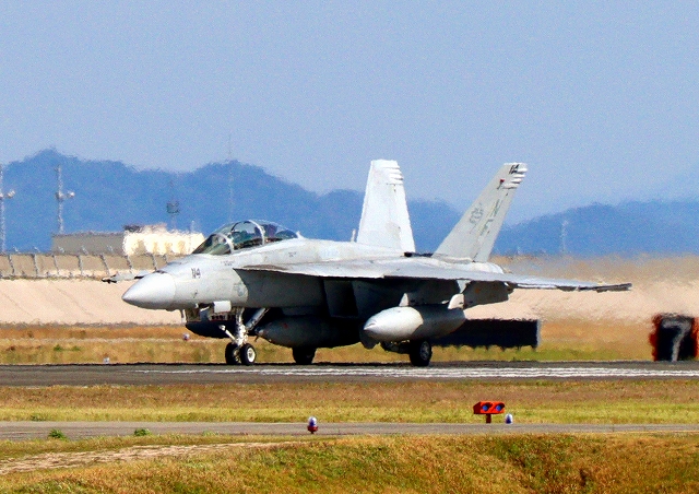 米海軍艦載機 F/A-18F スーパーホーネット 戦闘攻撃機(岩国基地)、NF、101番機が着陸 |