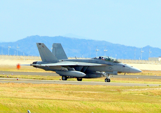 米海軍艦載機 F/A-18F スーパーホーネット 戦闘攻撃機(岩国基地)、NF、114番機が着陸 |