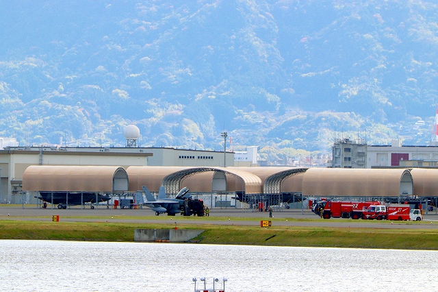 米海軍艦載機 F/A-18F スーパーホーネット 戦闘攻撃機(岩国基地)、NF、114番機のそばに緊急車両が! |
