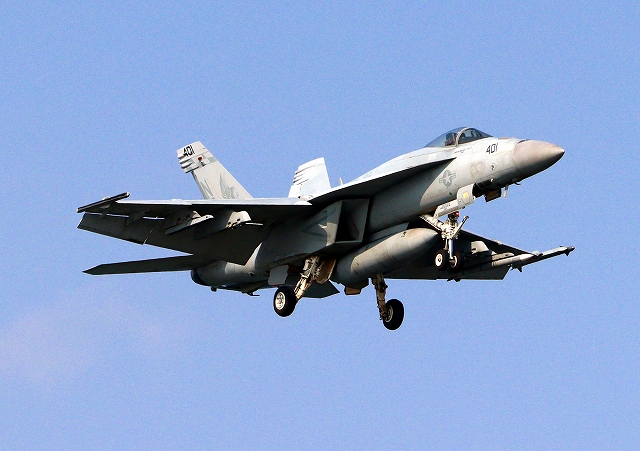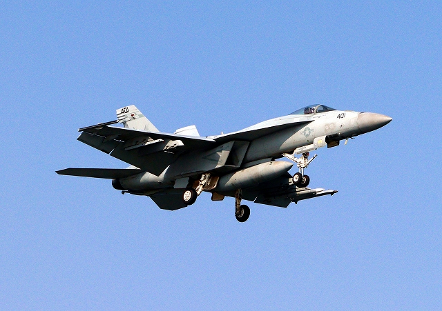 米海軍艦載機 F/A-18E スーパーホーネット 戦闘攻撃機(岩国基地)、NF、401番機が着陸 |