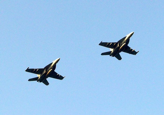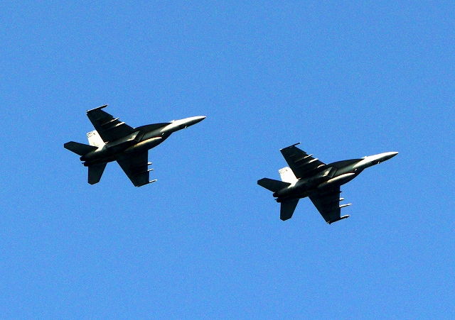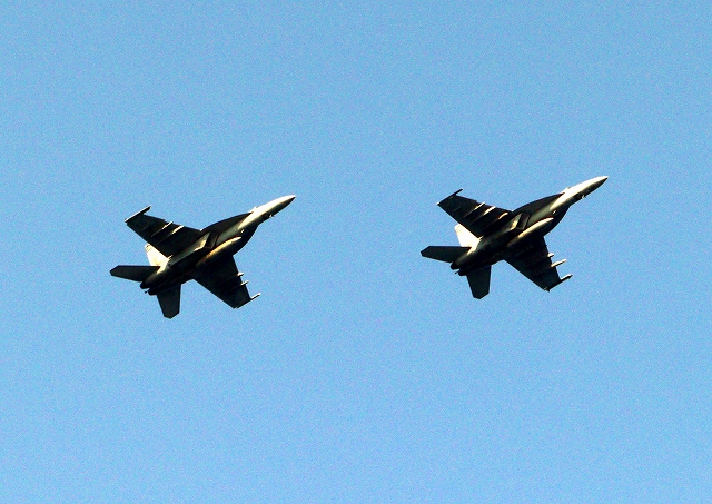 米海軍艦載機 F/A-18E スーパーホーネット 戦闘攻撃機(岩国基地)、NF、404番機、407番機が2機編隊で帰還 |